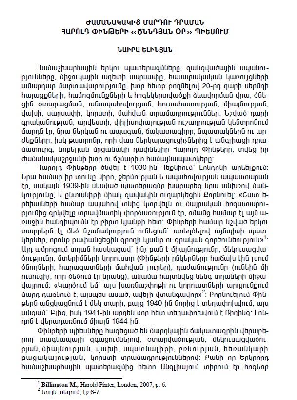 After the World War II England was in spiritual crisis, and Pinter succeeded in drawing the tragic picture of a contemporary man describing in exact colours the crisis and inner search of his century. The playwright pictures those critical states in which the individuals find themselves: the human being is lonely, troubled, alienated and secluded from the society, confused and frightened in the enemy world, he is always in a search of a home – a safe shelter. Pinter has reflected the complex and controversial inner world of the human being. He succeeded in emphasizing the drama of an individual, their views and perceptions that are well presented in Pinter’s ‘Birthday Party’.